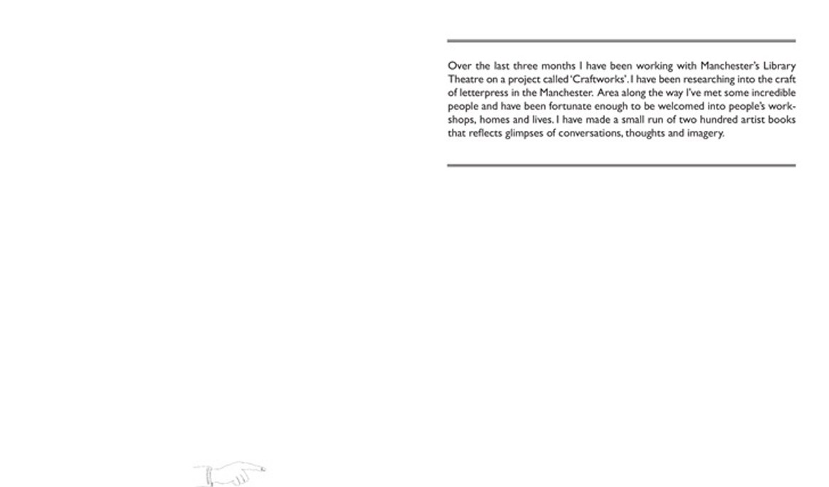In 2010, Amy was invited to explore the craft of Letterpress in the Manchester area, as part of Library Theatre’s ‘Craftworks’ programme. Over three months, she interviewed some of the people working with Letterpress today, and recorded their conversations in drawings, interviews and fragments of remembered speech. This work threads together the commercial, creative and personal histories of Letterpress, through the skills of the technique itself. It provides a speculative archive of Letterpress as a craft, an aesthetic, and a community. Amy’s project culminated in a limited edition of 200 artists’ books: A Whistle-Stop Tour of Letterpress, published in 2011.