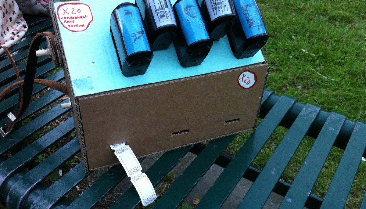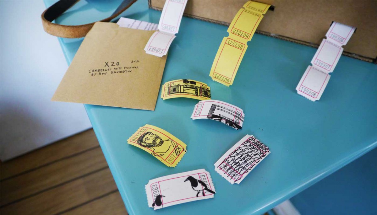 Following the Festival’s theme – transport – Amy transformed her drawings into tickets, which she dispensed on public transport around the area. Boarding buses with a cardboard ticket dispenser, Amy asked people to pick a drawing, then dispensed a copy, stamped it, and gave it away. These micro-performances intervened in the transactional economy of the transport system by creating an alternative, gift economy of art in unexpected places. At the same time, Amy’s drawing-tickets transformed personal memories into documents of time and space, enacting Camberwell as a public space and a collective memory.